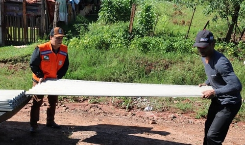 Cerca de 1.400 telhas de "eternit" foram distribuídas neste sábado, no distrito de Jaracatiá, em Goioerê. Foi para atender famílias que tiveram casas danificadas com a chuva de granizo na madrugada de sexta-feira. O prefeito Betinho Lima deu uma mãozinha na hora de descarregar as telhas...
