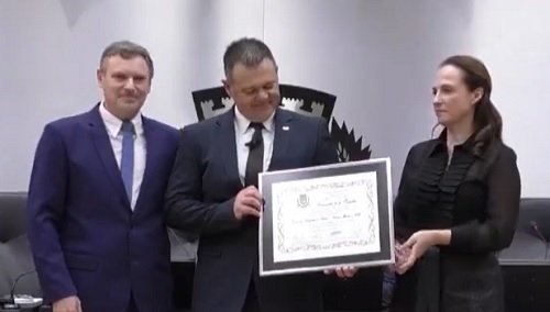 A Câmara de Campo Mourão realizou sessão solene nesta quinta-feira. Foi para entregar a Comenda 10 de Outubro para a Subseção da OAB, que completa 45 anos. O presidente da subseção, Andrey Legnani, recebeu a homenagem do vereador autor, Escrivão Parma, e da procuradora geral da prefeeitura, Alessandra Chiroli.