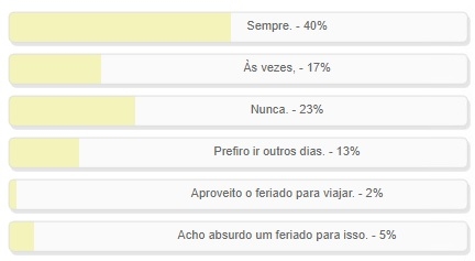 "Você vai ao cemitério no Dia de Finados?" Enquete encerrada neste domingo deu vitória à opção "Sempre", com 40% dos votos. "Nunca" teve 23% e "Às vezes" 17%. Outros 13% foram na opção "Prefiro ir outros dias", enquanto 5% acha "absurdo" existir feriado para isso. O resultado completo está no quadro acima.