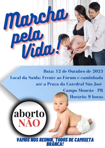 "Marcha pela vida". Esse é o nome do movimento que está sendo organizado para acontecer em Campo Mourão no próximo dia 12, às 9h. Será uma caminhada contra a legalização do aborto. Vai do fórum até a praça São José. A descriminalização do aborto (até 12 semanas) está em discussão no STF.