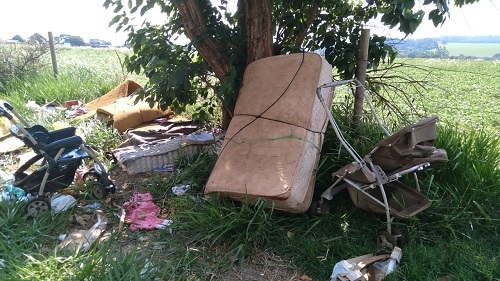 “Rua: Apolônia Staniszewski, fundos do supermercado Condor. Irresponsabilidade com o descarte de resíduos. Tem sido comum este tipo de cena aqui. Moro próximo ao local. Além de outros transtornos como o foco de larvas mosquito. Este tipo de local, serve para criadouro de escorpiões também. Por favor. Respeitem este bairro”