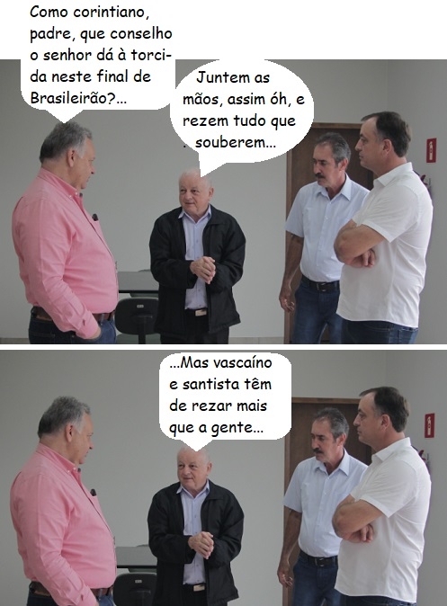 Os cliques são de Ubiratã, onde a prefeitura inaugurou esta semana a nova Secretaria de Viação e Serviços Rurais. O padre Pedro Speri fez as bênçãos e aproveitou para colocar a conversa em dia com o prefeito Fábio D’Alécio e equipe. Speri, que já foi vice-prefeito de Goioerê e atou em paróquias de Campo Mourão, é torcedor do Corinthians, que vem aos trancos e barrancos no atual Brasileirão...