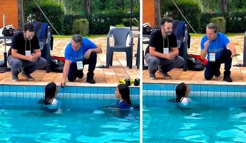 Olha aí o secretário de Estado Márcio Nunes (Turismo) dando uma de repórter. Foi em Foz do Iguaçu, durante uma demonstração de aulas de mergulho em água doce. O evento era justamente para incentivar o turismo em áreas de água doce do Paraná. Aí Márcio entrevistou, com microfone e tudo, as meninas que tinham passado pela experiência e, pela primeira vez, mergulhar com equipamentos.