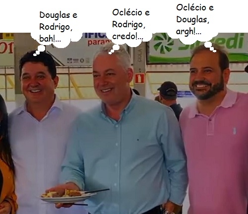 Olha quem se encontrou neste domingo, no Boi no Rolete servido pelo Rotary, em Campo Mourão. O prefeito Oclécio Meneses (Farol), o deputado Douglas Fabrício e o ex-vice-prefeito Rodrigo Salvadori. Os três estão cotados para saírem candidatos a prefeito de Campo Mourão na eleição do ano que vem. Ah, digamos que estavam unidos por uma boa causa, afinal, parte da renda do almoço vai para a Casa das Fraldas...