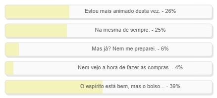 “Dezembro chegando, como está seu “espírito natalino” para este ano?” Enquete encerrada neste domingo deu vitória à alternativa “O espírito está bem, mas o bolso...”, com 39% dos votos. Em seguida vieram, coladinhos, “Estou mais animado desta vez”, com 26%, e “Na mesma de sempre”, com 25%. O resultado completo está no quadro acima.