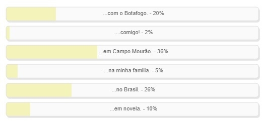 “...em Campo Mourão!” venceu a enquete de “complete a frase” de Boca Santa, encerada neste domingo. Teve 36% dos votos. “No Brasil” ficou em segundo lugar, com 26%, e “Com o Botafogo” em terceiro, com 20%. O resultado completo está no quadro acima.