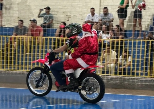 Terra Boa – A prefeitura promove nesta quinta-feira (20h) a chegada do Papai Noel à cidade. No distrito de Malu o evento já aconteceu e o “bom velhinho” surgiu no ginásio de esportes na garupa de uma motocicleta.
