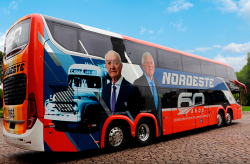 O Expresso Nordeste, de Campo Mourão, completou 60 anos em junho. Para marcar a data, apresentou um ônibus com pintura retrô e homenagens. O coletivo veio com as cores vermelho, azul e branco e a logomarca que por vários anos marcou os ônibus da empresa. Também traz as fotos dos irmãos que administram a Nordeste há mais de 40 anos - Teófilo e Germano Boiko, filhos do fundador Vassílio Boiko.
