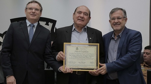 O delegado-chefe da 16ª SDP, Nilson Rodrigues da Silva, recebeu esta semana moção da Câmara. Ele representou a equipe da delegacia, que foi homenageada por uma ação em 2020, quando policiais civis de Campo Mourão descobriram um helicóptero com 430 kg de cocaína. A aeronave estava abandonada em Corumbataí do Sul. O vereador Escrivão Parma, autor da moção, e o prefeito Tauillo Tezelli, fizeram a entrega. O deputado Douglas Fabrício também participou.
