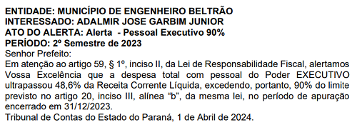 O Tribunal de Contas do Estado publicou nesta sexta-feira alertas para oito prefeituras do Paraná. Engenheiro Beltrão foi uma delas. Motivo? O município encerrou o segundo semestre de 2023 comprometendo acima de 48,6% da receita corrente líquida com a folha de pagamento. Não estourou o limite da Lei de Responsabilidade Fiscal, que é 54%, mas já requer atenção do prefeito Junior Garbim.