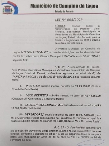O prefeito de Campina da Lagoa que se eleger este amo vai assumir o mandato com salário de R$ 29,1 mil.