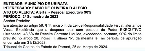 A prefeitura encerrou o segundo semestre de 2023 comprometendo acima de 48,6% da receita corrente líquida com a folha de pagamento. O alerta endereçado ao prefeito Fábio D’Alécio foi publicado nesta terça-feira pelo Tribunal de Contas do Estado. O limite da Lei de responsabilidade Fiscal é de 54%, mas o percentual atingido já requer cuidados da administração.