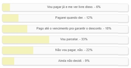 “Campo Mourão já lançou o IPTU pela internet. Como você pretende pagá-lo?”. Enquete com essa pergunta foi encerrada neste domingo. Vitória para a alternativa “Vou parcelar”, com 33% dos votos. “Não vou pagar, não” ficou em segundo, com 22%. Já “Pago até o vencimento para garantir o desconto” teve 18%. O resultado completo está no quadro acima.