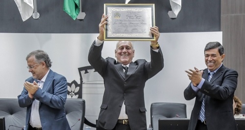 A Câmara de Campo Mourão realizou sessão solene neste sábado à noite. Foi para a entrega do título de Cidadania Honorária ao músico Yé, do grupo Minuano. A homenagem estava aprovada desde 2011. O prefeito Tauillo Tezelli e o ex-vereador Sidnei Jardim (autor do projeto) fizeram a entrega. O deputado Douglas Fabrício também participou. Ao final da sessão foram cantadas duas músicas.