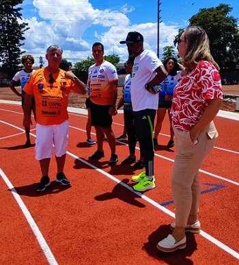 Um dos maiores nomes do atletismo brasileiro, Zequinha Barbosa, esteve neste domingo em Campo Mourão. Veio conhecer a nova pista de atletismo. Foi a convite do professor Paulo César Costa. O vereador Bina Teixeira e a secretária Karla Tureck (Esporte) acompanharam a visita, além do Paulinho, é claro. Zequinha foi campeão mundial indoor dos 800 m, em 1987, em Indianápolis/EUA. Disputou quatro olimpíadas – Los Angeles (84), Seul (88), Barcelona (92) e Atlanta (96).