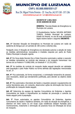O decreto, publicado na quinta-feira, permite dispensa de licitação, se necessário, e contratação de pessoal.