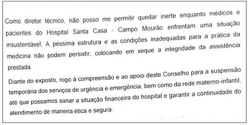 O diretor técnico da Santa Casa de Campo Mourão, Deorque Nogueira, enviou ofício, sexta-feira, ao CRM.