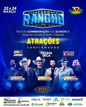 Saiu a programação da Expo-Rancho, o evento que vai comemorar os 32 anos de emancipação de Rancho Alegre do Oeste. Serão três dias de festa. Na abertura, dia 22 de março, acontece show com a dupla Jads & Jadson. No dia 23 tem Fiduma & Jeca e, no encerramento, dia 24, a cantoria fica por conta de Pedro Paulo & Alex. Também haverá rodeio. Na sexta e domingo a entrada é franca. No sábado será cobrado um litro de óleo de soja.