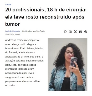 O portal UOL destacou a história de Andressa Cordeiro, 24, que, quando criança, foi diagnosticada com hemangioma cavernoso, um tumor vascular benigno. No ano passado, ela foi submetida a uma cirurgia que envolveu 20 profissionais e que durou 18 horas. Detalhe: Andressa é de Luiziana.