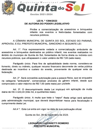 A partir de agora é proibido vender brinquedos em eventos que tenham recursos públicos em Quinta do Sol.