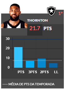 Está rolando mais uma edição do NBB, a primeira divisão do basquete-m brasileiro. Ainda não foi desta vez que Campo Mourão voltou a participar, mas tem ex-mourãoense se destacando. O norte-americano Isaac Thornton, que jogou por aqui, é o cestinha da competição. Fez até agora uma média de 21,7 pontos por jogo. Isso que ele está no Botafogo, que é apenas o 15º na tabela. Somente na vitória sobre o Corinthians, por 91 a 86, Thornton marcou 35 pontos. O ex-Campo Mourão também é líder em lances livres.