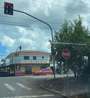 Os galhos da árvore estão tapando a visualização do sinaleiro na subida da rua Panambi esquina com a Perimetral. Uma poda resolveria o caso, antes de um acidente”.