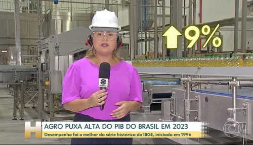 O Jornal Hoje, da Globo, mostrou nesta sexta-feira reportagem sobre o crescimento de 15,1% da agropecuária em 2023. O agro foi responsável por 42% do PIB brasileiro, que cresce 2,9%. Para ilustrar os números, o JH foi à indústria de óleo de soja da Coamo, em Dourados/MS, onde a produção cresceu 9% no ano passado em relação ao período anterior.
