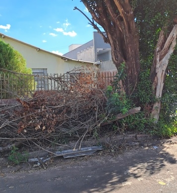 “Rua Rolândia, conjunto Parigot de Souza em Campo Mourão. No último temporal do ano passado caíram várias árvores e os galhos ainda não foram retirados. O pedestre tem que andar pela rua, e o local propício para escorpiões e outros insetos, além do risco de incêndio; O local nem recebeu a pintura de faixa de trânsito.