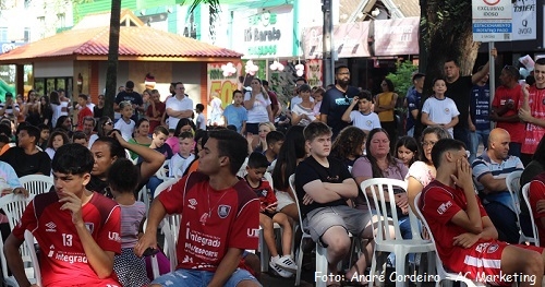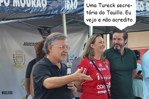 O clic é de sábado, na praça São José. O prefeito de Campo Mourão, Tauillo Tezelli, discursa em evento do Campo Mourão Futsal. Ao lado, a secretária Karla Tureck (Esporte) e o presidente da Acicam, Bem-Hur Berbet. O deputado Douglas Fabrício e o vereador Bina Teixeira também prestigiaram a entrega de kits do projeto social Formando Campeões.