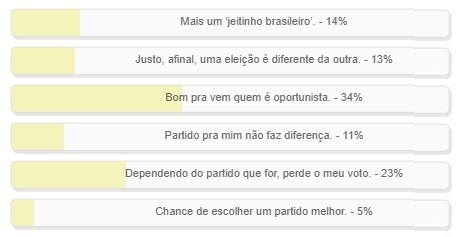 “Este mês abre a janela partidária e vereadores podem trocar de partido sem perder o mandato. O que você acha disso?” Enquete com essa pergunta foi encerrada neste domingo. Venceu a alternativa “Bom para quem é oportunista”, com 34% dos votos. “Dependendo do partido que for, perde meu voto” ficou em segundo, com 23%. “Mais um jeitinho brasileiro” teve 14%. O resultado completo está no quadro acima.