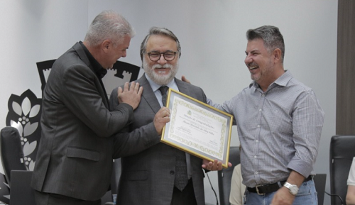Sessão da Câmara de Campo Mourão sem homenagem, não é sessão da Câmara de Campo Mourão. Nas duas realizadas esta semana não foram votadas moções, nem títulos, mas teve entrega nesta terça-feira. O pastor Álvaro Martinho da Silva Filho, da Igreja Adventista, recebeu moção pelos 40 anos de ministério. Em Campo Mourão ele está desde 2021. A homenagem foi entregue pelo autor, o presidente Edilson Martins, e pelo diretor de Gabinete da prefeitura, Ricardo Borges.