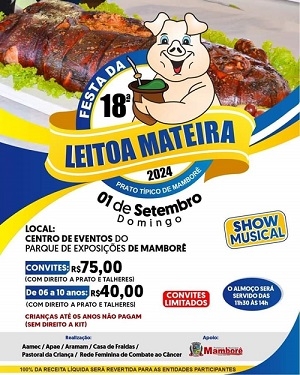 Mais um município da região confirmou a realização da festa do prato típico. Agora foi Mamborê, que marcou a 18ª Festa da Leitoa Mateira para o dia 1º de setembro, no Parque de Exposições. A realização fica por conta de seis entidades, com apoio da prefeitura. O convite custa R$ 75 (R$ 40 para crianças de 6 a 10 anos).