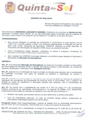O prefeito de Quinta do Sol, Leonardo Romero, decretou situação de emergência.