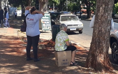 Enquanto os novos pontos de ônibus não ficam prontos, a população se vira como pode e até caixa de papelão vira banco improvisado.