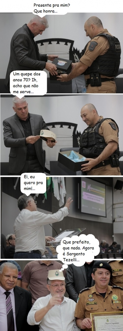 Os cliques são desta terça-feira, quando a Câmara de Campo Mourão entregou moção para o 11º BPM. O presidente Edilson Martins ganhou de presente um quepe da década de 1970, que até o prefeito Tauillo Tezelli experimentou...