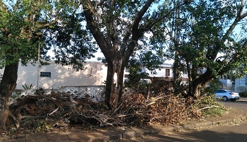 Árvores condenadas e muita sujeira na rua São Carlos, esquina com a rua: Mato Grosso, jardim Flórida.