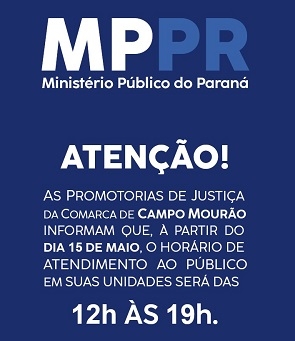 Campo Mourão – O Ministério Público começa nesta quarta-feira a atender em novo horário. Será das 12h às 19h. A medida segue alinhamento com o Tribunal de Justiça (fórum).