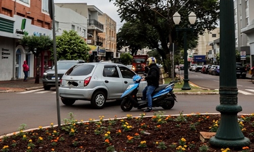 Carro desce pela rua Francisco Albuquerque e cruza av. Manoel Mendes de Camargo pela contramão. Quase bateu num motociclista. Isso às 8h desta terça-feira.