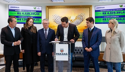 O governador Ratinho Jr liberou nesta terça-feira mais R$ 66,7 milhões para 14 municípios através do programa Asfalto Novo, Vida Nova. Deste total, R$ 5,5 milhões são para Janiópolis, sendo R$ 4,3 milhões para asfalto e R$ 1,2 milhão para iluminação pública. O prefeito Ismael Dezanoski recebeu a liberação ao lado do secretário de Estado Márcio Nunes (Turismo) e dos deputados Alexandre Curi e Maria Victória.
