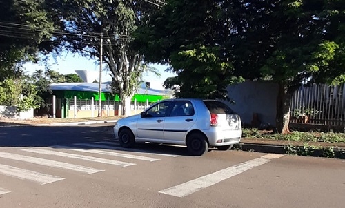 Carro estacionado muito na esquina de uma rua estreita, perto do Centro Social Urbano, e complica no cruzamento porque a gente não consegue enxergar quem vem no sentido da rua. Sem contar que está em cima da faixa de pedestre.