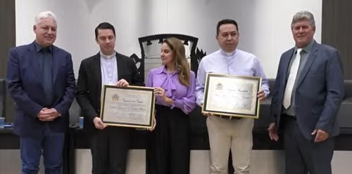 O padre Adilson Naruishi agora é cidadão benemérito de Campo Mourão. O título foi entregue nesta quinta-feira à noite em sessão solene da Câmara. A vice-prefeita Fátima Nunes e o vereador Paulo Pilatte, autor da proposta, fizeram a entrega. Também foi entregue a Comenda 10 de outubro para a Caritas Diocesana, que foi representada pelo padre Wesley. O deputado Douglas Fabrício prestigiou a sessão, que teve a presença de cinco vereadores.