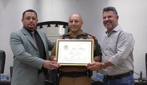 Sessão da Câmara de Campo Mourão sem homenagens não é sessão da Câmara de Campo Mourão. Nesta terça-feira nenhum título ou moção foi votado, mas houve sessão solene para entrega do título de Mérito Militar ao subtenente Adrians Ferreira. Ele recebeu a homenagem das mãos do vereador-autor, Subtenente Macedo, e do chefe de Gabinete da prefeitura, Ricardo Borges.