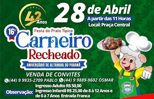 Começou a venda dos convites para a 16ª Festa do Carneiro Recheado, no próximo dia 28, em Altamira do Paraná. É o prato típico local, que será servido dentro da programação de aniversário do município (42 anos). O convite custa R$ 50. Criança de 8 a 12 anos paga R$ 25. Agora, cá pra nós: é impressão ou o desenho do carneiro do buraco, de Campo Mourão, foi parar em Altamira do Paraná?...
