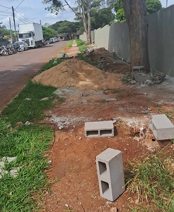 Calçada do Cemitério Municipal de Campo Mourão com materiais de construção impedindo a passagem de pedestres
