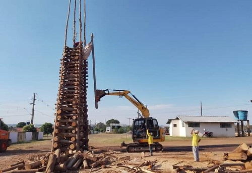 Retroescavadeira trabalha na montagem da fogueira de 13 metros de altura que será acesa neste sábado no Arraiá de Aniversário de Farol. O município comemora no fim de semana 31 anos de emancipação. Nesta quinta-feira o prefeito Oclécio Meneses confirmou o pagamento antecipado de 50% do 13º salário. Segundo ele, o município tem muito o que comemorar, com R$ 30 milhões em investimentos e R$ 13,5 milhões em caixa.