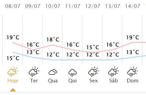 Pelo menos é o que diz o Simepar. Pela previsão só na quarta-feira não chove em Campo Mourão. Estão previstos 10,2 mm para esta segunda, 6,9 mm para terça, 39,4 mil para quinta, 7,3 mm para sexta. 9,5 mm para sábado e 8 mm para domingo. Nesse período, a temperatura máxima não passa de 19 grais e a mínima fica nos 12 graus.