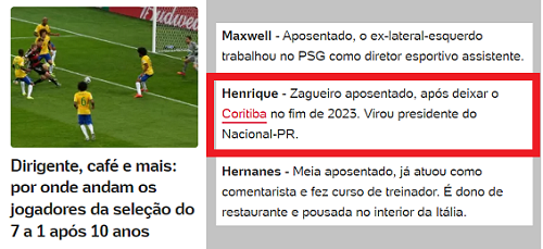 O inesquecível 7 a 1 que o Brasil levou da Alemanha nas semifinais da Copa de 2014 está completando 10 anos. O portal UOL publicou neste domingo matéria para mostrar o que estão fazendo os jogadores brasileiros daquela Copa. Um deles virou dirigente e está morando em Campo Mourão. O UOL não diz isso, mas cita que o zagueiro Henrique (que era reserva) hoje preside o Nacional/PR.