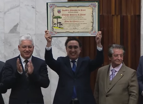 A Assembleia Legislativa entregou nesta terça-feira o título de Cidadão Honorário do Paraná ao ex-prefeito de Campo Mourão Milton Luiz Pereira (1963/67). A homenagem foi póstuma (Pereira morreu em 2012) e o título foi recebido pelo filho dele, Marcos Vinícius Tadeu Pereira. A entrega foi feita pelo ex-deputado Namir Piacentini, que propôs a homenagem em 1993, e pelo deputado Douglas Fabrício, que presidiu a sessão.