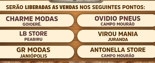 Em Campo Mourão os pontos de venda serão as empresas Ovídio Pneus e Antonella Store.