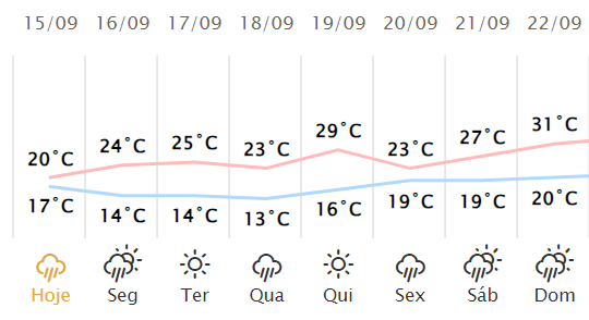 A semana começou chuvosa em Campo Mourão e, pela previsão do Simepar, vai chover praticamente dia sim, dia não. Chove um pouquinho (1,5 mm) na segunda, não chove na terça, chove na quarta (31,3 mm), não chove na quinta, mas volta a chover na sexta (20,4 mm), no sábado (5,6 mm) e no próximo domingo (4,2 mm). Nesse período, a temperatura vai variar de 13 a 31 graus.